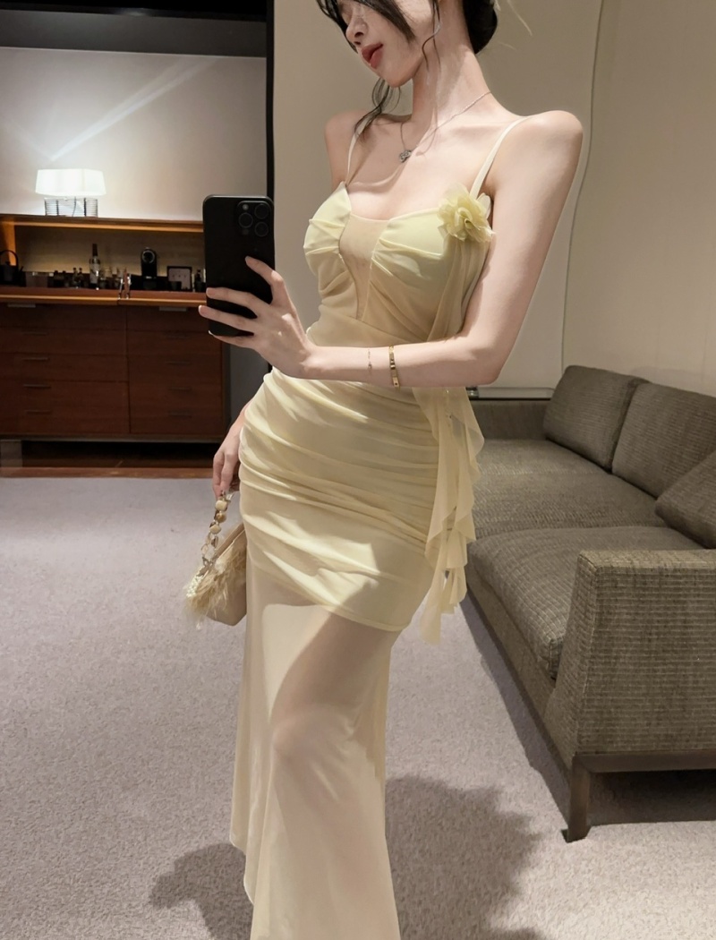 Sling long sexy bottoming gauze low-cut hollow dress