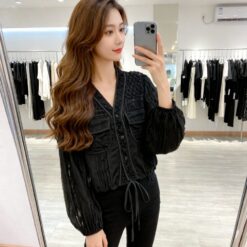 Drawstring hollow tops France style V-neck coat for women