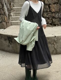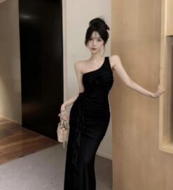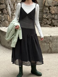 Sexy bottoming gauze shoulder low-cut hollow long dress