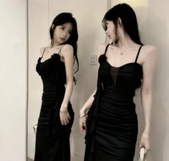 Sling long sexy bottoming gauze low-cut hollow dress