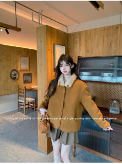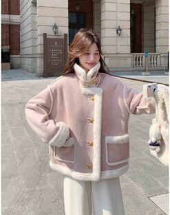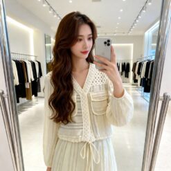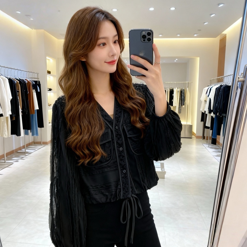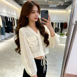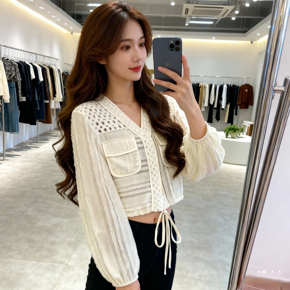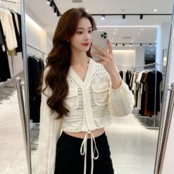 Drawstring hollow tops France style V-neck coat for women