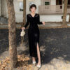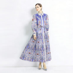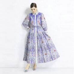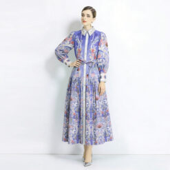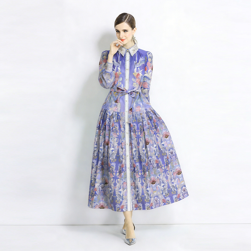 Lapel retro long dress spring and autumn printing dress 2pcs set