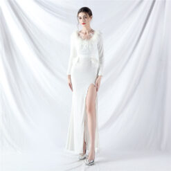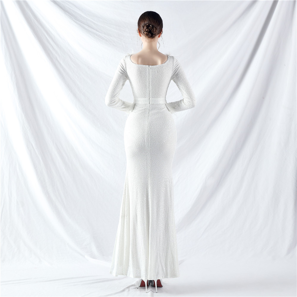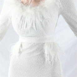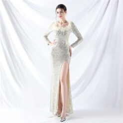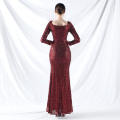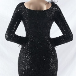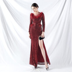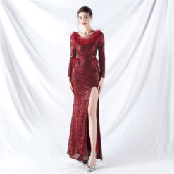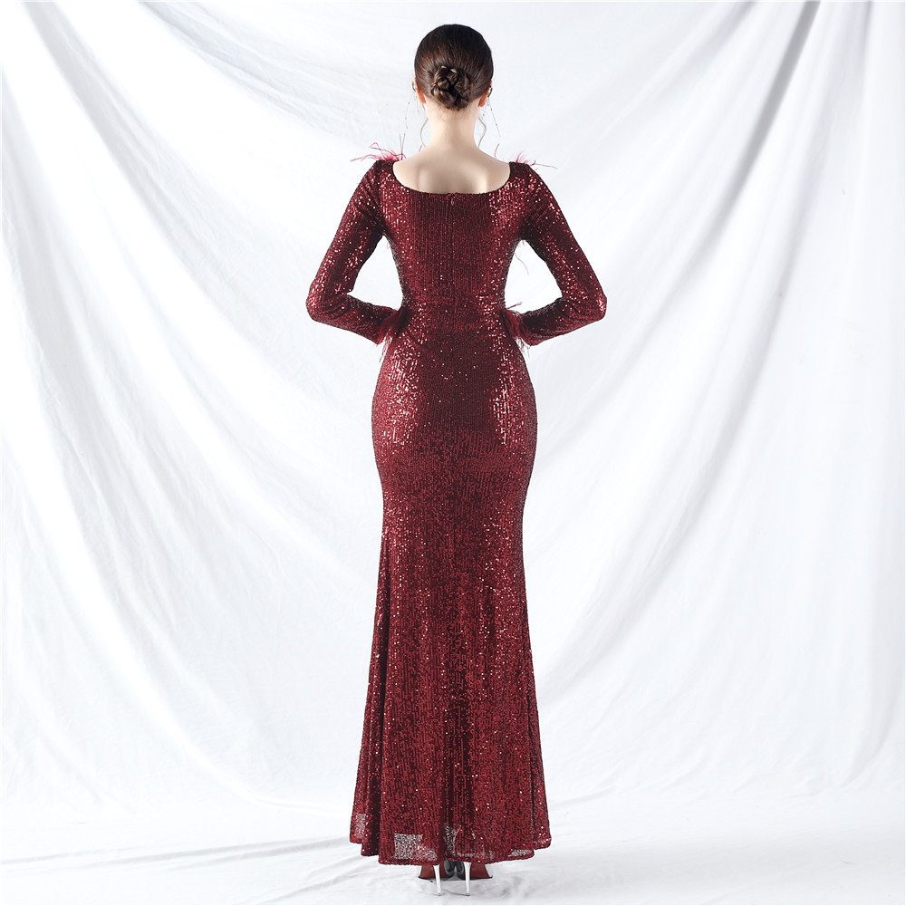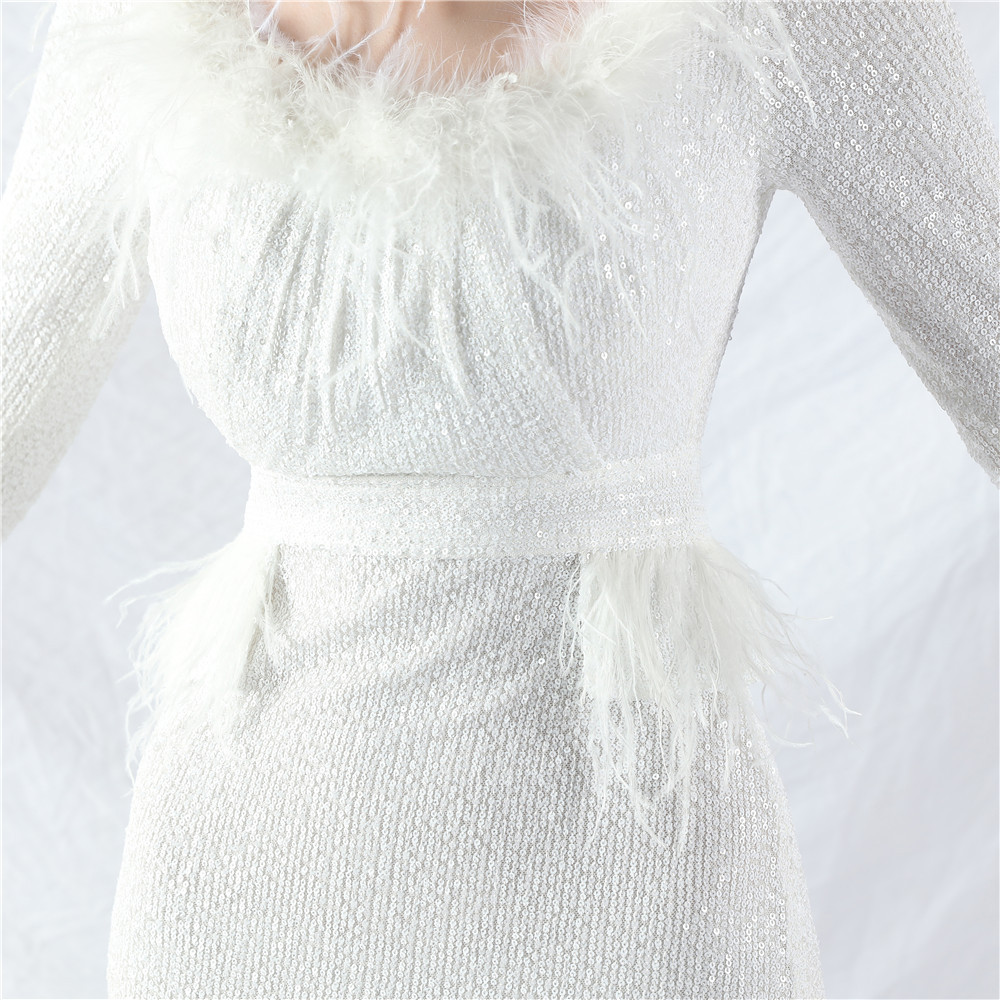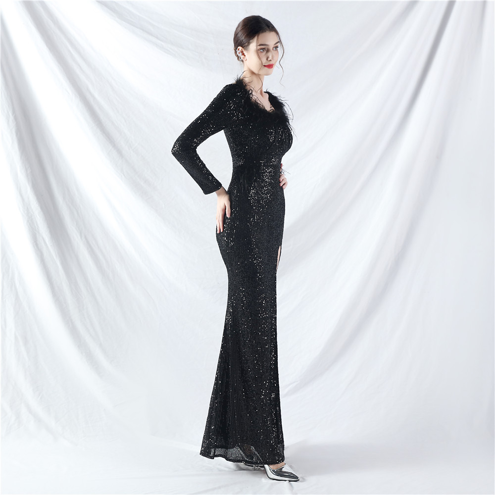 Sequins ostrich hair long sleeve evening dress