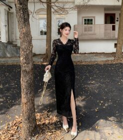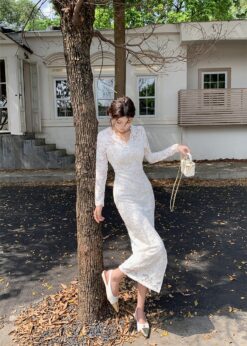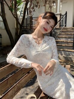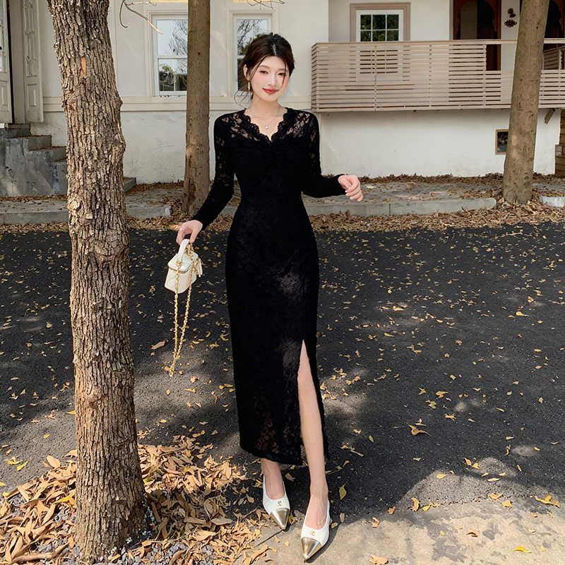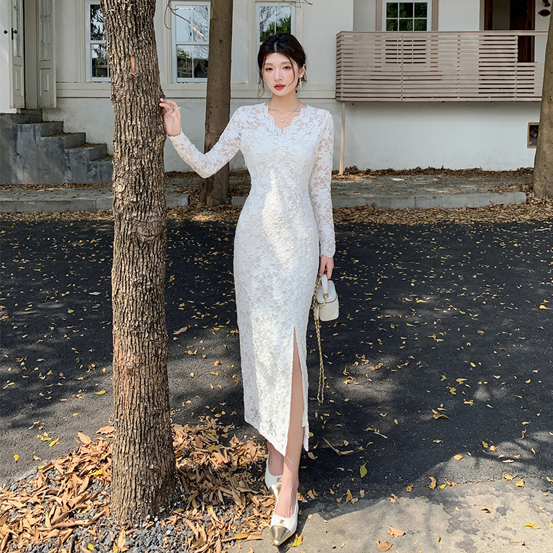 Slim package hip lace V-neck spring long sleeve dress